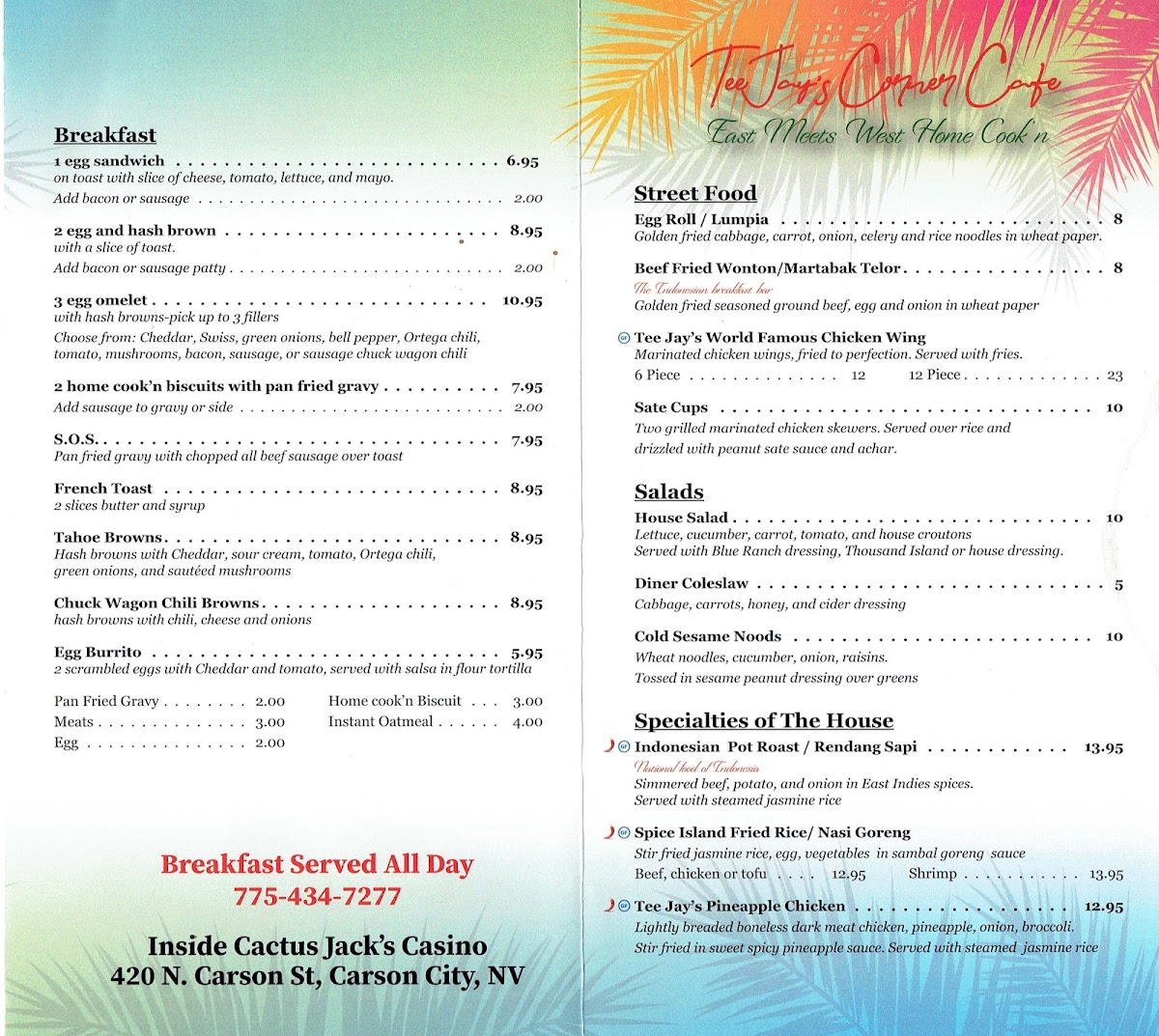 Welcome to Tee Jay's Corner Cafe, an exquisite gem nestled within the vibrant Cactus Jack's Casino in Carson City, Nevada. This Indonesian restaurant invites you on a culinary adventure that tantalizes the senses and expands your palate, offering a delightful fusion of Asian flavors in a casual yet dynamic dining atmosphere.